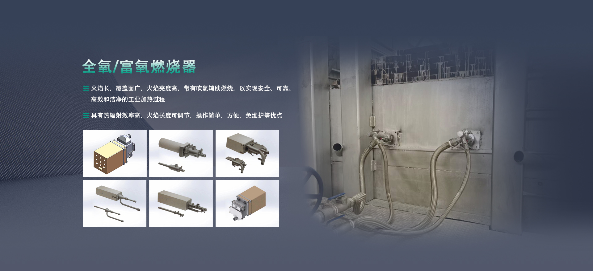提供方案:成套熱能解決方案。高溫領(lǐng)域,采用富氧或全氧燃燒系統(tǒng),包括窯爐控制系統(tǒng)、全氧燃燒閥組、燒槍組件等